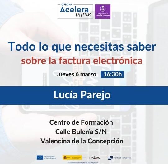 Acelera Pyme te invita a participar en la jornada “Todo lo que necesitas saber sobre la factura electrónica”, un evento diseñado para resolver todas tus dudas y ayudarte en la transición hacia este nuevo modelo digital. La sesión se llevará a cabo el jueves 6 de marzo a las 16:30, en el Centro de Formación, C/Bulería s/n, en Valencina de la Concepción.