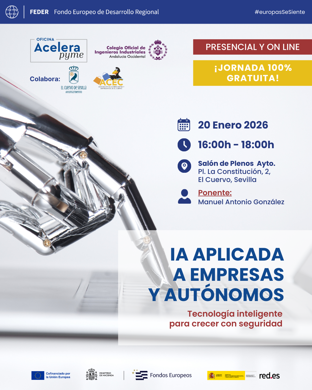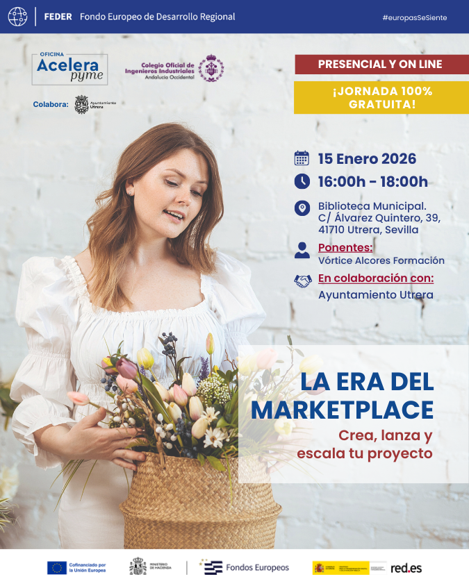 Biblioteca Municipal Utrera C. Álvarez Quintero, 39, Utrera2 horas para entender cómo dar visibilidad, validar y vender tu proyecto La Era de Marketplace es una jornada formativa para autónomos y emprendedores que quieren entender cómo crear, lanzar y escalar su proyecto con una visión clara de negocio. Durante dos horas, los ponentes abordarán los pilares clave que hoy marcan la diferencia entre […]