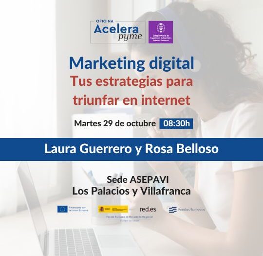 En Acelera Pyme seguimos comprometidos en ofrecerte las herramientas necesarias para potenciar tu negocio en el mundo digital. Por eso, te invitamos a nuestra próxima jornada titulada “Marketing Digital: tus estrategias para triunfar en internet”, que se celebrará el martes 29 de octubre a las 8:30 de la mañana en la sede de ASEPAVI en Los Palacios y Villafranca.