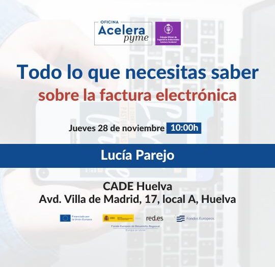 Acelera Pyme te invita a un nuevo evento enfocado en uno de los cambios más importantes para empresas y autónomos en el ámbito de la facturación: la transición a la factura electrónica. Este taller, titulado «Todo lo que necesitas saber sobre la factura electrónica», se celebrará el próximo jueves 28 de noviembre a las 10:00 am en el CADE de Huelva. Contará con la participación de Lucía Parejo, quien se encargará de guiar a los asistentes en los aspectos clave de este nuevo modelo de facturación.